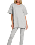 This premium set combines comfort and style with its oversized t-shirt and fitted leggings design. Made from high-quality cotton blend fabric that offers excellent breathability and stretch. The t-shirt features a relaxed, roomy cut with dropped shoulders and short sleeves, perfect for casual everyday wear. The matching leggings have a high-waisted design with full-length coverage. The heather grey color adds a versatile, classic touch that pairs well with any casual wardrobe. Ideal for home lounging, running errands, or light activities.