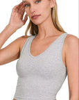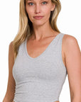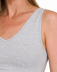 This essential v-neck cami tank top features a classic sleeveless design perfect for layering or standalone wear. Crafted from soft, stretchy cotton blend fabric in heather gray, it offers comfortable all-day wear with a flattering form-fitting silhouette. The cropped length and ribbed texture add modern appeal, while the timeless v-neckline creates an elegant look. Ideal for casual outings, workout sessions, or as a versatile wardrobe staple that pairs effortlessly with jeans, skirts, or shorts.