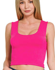 This stylish hot pink crop tank top features a classic scoop neckline and sleeveless design, crafted from soft, stretchy fabric that hugs the body comfortably. The cropped length hits just above the waist, making it perfect for pairing with high-waisted jeans, skirts, or shorts. The vibrant hot pink color adds a bold pop to any outfit, while the minimalist design ensures versatility for both casual and semi-casual occasions. The breathable material makes it ideal for warm weather wear, workouts, or layering under jackets and cardigans.