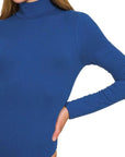 This elegant turtleneck bodysuit features a sophisticated design with long sleeves and a classic high neckline. Made from premium stretch fabric that contours to your body for a flattering fit. The seamless construction ensures smooth lines under clothing while the convenient snap closure bottom provides easy wear. Perfect for layering or wearing alone, this versatile piece combines comfort with style. The rich blue color adds a pop of sophistication to any wardrobe. Ideal for both casual and dressy occasions, offering excellent stretch and recovery for all-day comfort.