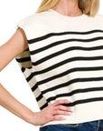 This fashion sleeveless sweater vest features a timeless black and white striped pattern. Made from high-quality knit material, it offers both comfort and style. The cropped length and boxy silhouette create a contemporary look that's perfect for layering. The ribbed crew neckline adds a classic touch, while the sleeveless design makes it versatile for multiple seasons. Ideal for casual everyday wear, this sweater vest can be paired with everything from jeans to skirts. The contrasting stripes create visual interest while maintaining a clean, minimalist aesthetic.