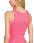 This stylish ribbed knit tank top features a modern cropped length and sleeveless design perfect for warm weather. Made from a soft, stretchy knit fabric with vertical ribbing texture throughout. The fitted silhouette and crew neckline create a flattering look that pairs easily with high-waisted bottoms. The bright pink color adds a fun pop to any outfit. Ideal for casual wear or layering under jackets and cardigans. The seamless construction and quality knit material ensure both comfort and durability.