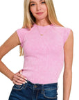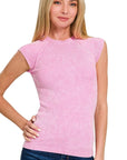 This fashion sleeveless top features a unique acid wash treatment in a beautiful lavender blue shade. The ribbed texture adds interesting detail while providing a flattering fit. Made from a soft, stretchy cotton blend material that ensures both comfort and durability. The cap sleeve design and crew neckline create a classic silhouette that can be dressed up or down. Perfect for casual everyday wear or as a layering piece. The form-fitting style accentuates the body's natural shape while remaining comfortable throughout the day. Ideal for spring and summer wardrobes.